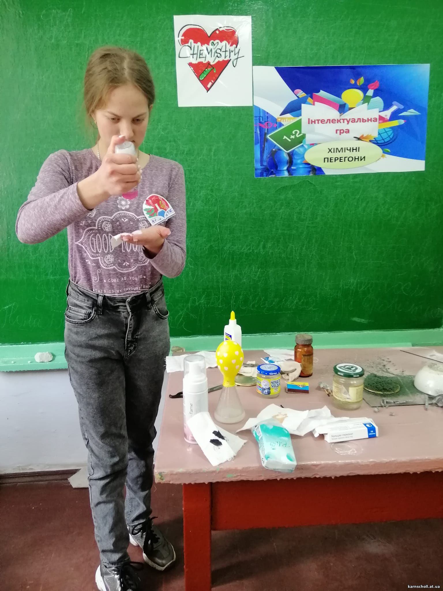 Інтелектуальна гра "Хімічні перегони", в якій взяли участь учні 8-9 класів. "Юні хіміки" та "Хіменти" активно давали відповіді на запитання, демонстрували досліди та розгадували ребуси.